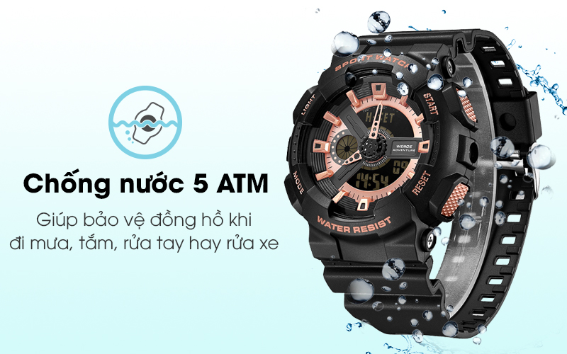 Chiếc đồng hồ quartz này có khả chịu nước ở mức 5 ATM, giúp người dùng yên tâm đeo khi đi mưa, rửa tay, tắm mà không ngại chiếc đồng hồ của mình sẽ bị vào nước.