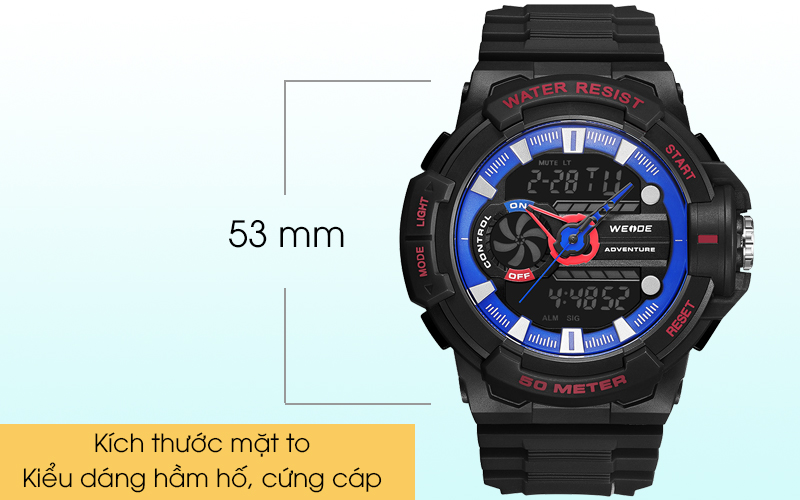 Mẫu đồng hồ Weide nam này có kích thước mặt khá lớn lên đến 53 mm nên chiếc đồng hồ điện tử này hiển thị khá đầy đủ và rõ ràng các thông tin như giờ, thứ, ngày, tháng. Có sự kết hợp giữa kim và số điện tử mang đến nhiều tiện lợi cho người dùng.