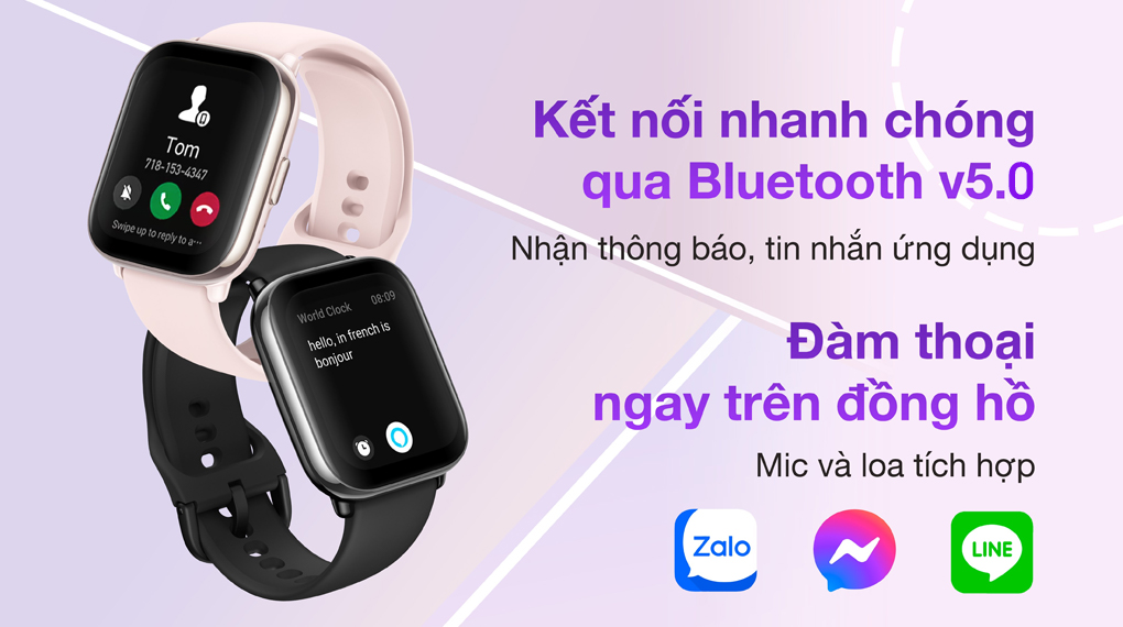 Đồng hồ thông minh Amazfit Active được trang bị Bluetooth 5.0 tiên tiến, tương thích với smartphone dùng hệ điều hành Android 7.0 trở lên và iOS 12.0 trở lên. Nhờ kết nối Bluetooth với điện thoại thông minh, bạn có thể thực hiện và trả lời cuộc gọi một cách tiện lợi ngay trên cổ tay, giúp luôn giữ liên lạc dù đang bận rộn.