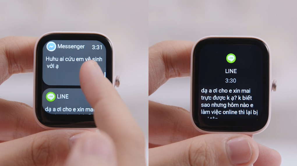 Đối với tin nhắn thì sẽ được hiển thị trực tiếp trên màn hình bằng phông chữ to, rõ ràng nhưng sẽ không thể trả lời tin nhắn trên đồng hồ. Còn với cuộc gọi thì mình nhận được thông báo cuộc gọi đến và từ chối cuộc gọi đó chứ không thể nhận cuộc gọi ngay trên đồng hồ.