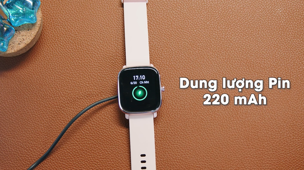 Chiếc đồng hồ này sở hữu viên pin 220 mAh cho thời gian sử dụng khoảng 14 ngày mà chỉ mất 2 giờ để sạc đầy. Nếu dùng những chức năng cơ bản (tắt theo dõi sức khỏe, tắt bluetooth) thì Amazfit GTS 2 Mini có thể hoạt động lên đến 21 ngày. Trong trường hợp quên mang theo dây sạc trong những chuyến đi dài thì bạn cũng không lo hết pin giữa chừng.