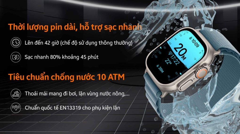 Đồng hồ thông minh cũng được trang bị chuẩn chống nước 10 ATM, cho phép chịu áp lực tương đương độ sâu 100 mét, vượt xa mức chống nước thông thường của các mẫu Apple Watch khác. Bên cạnh đó, thiết bị còn đạt chứng nhận EN13319, tiêu chuẩn quốc tế dành riêng cho các thiết bị lặn chuyên nghiệp, đảm bảo độ tin cậy cao khi sử dụng trong môi trường dưới nước.