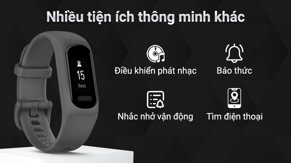 Chiếc Vivosmart 5 còn được Garmin tích hợp thêm nhiều tiện ích như: Tìm điện thoại, dự báo thời tiết, điều khiển chơi nhạc, điều khiển chụp ảnh, báo thức,... đồng hành cùng bạn cả ngày dài.