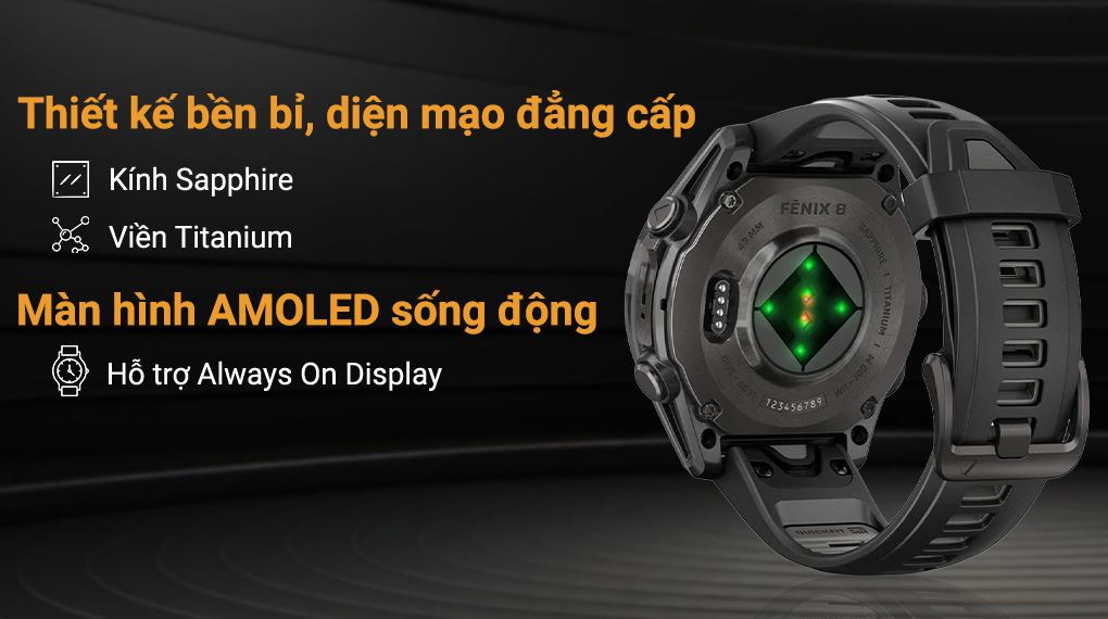 Được chế tác từ vật liệu cao cấp như khung polyme cốt sợi, viền Titanium và mặt kính Sapphire, Garmin Fenix 8 không chỉ toát lên vẻ ngoài mạnh mẽ mà còn có khả năng chống chịu vượt trội trong mọi điều kiện khắc nghiệt. Các nút bấm kim loại chống thấm giúp đồng hồ luôn sẵn sàng đồng hành cùng bạn trong mọi hành trình.