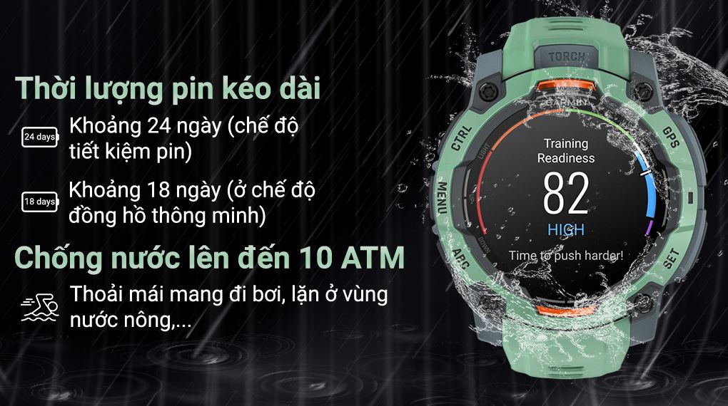Với tiêu chuẩn chống nước 10 ATM, Instinct 3 có thể chịu được áp suất nước ở độ sâu 100m, phù hợp cho các hoạt động bơi lội, lặn biển hoặc thể thao dưới nước,... mà không cần lo lắng về độ bền. Tuy nhiên, người dùng cần tránh mang thiết bị khi tắm nước nóng, không mang vào phòng xông hơi, tiếp xúc chất tẩy rửa mạnh,... để đảm bảo khả năng sử dụng lâu dài.
