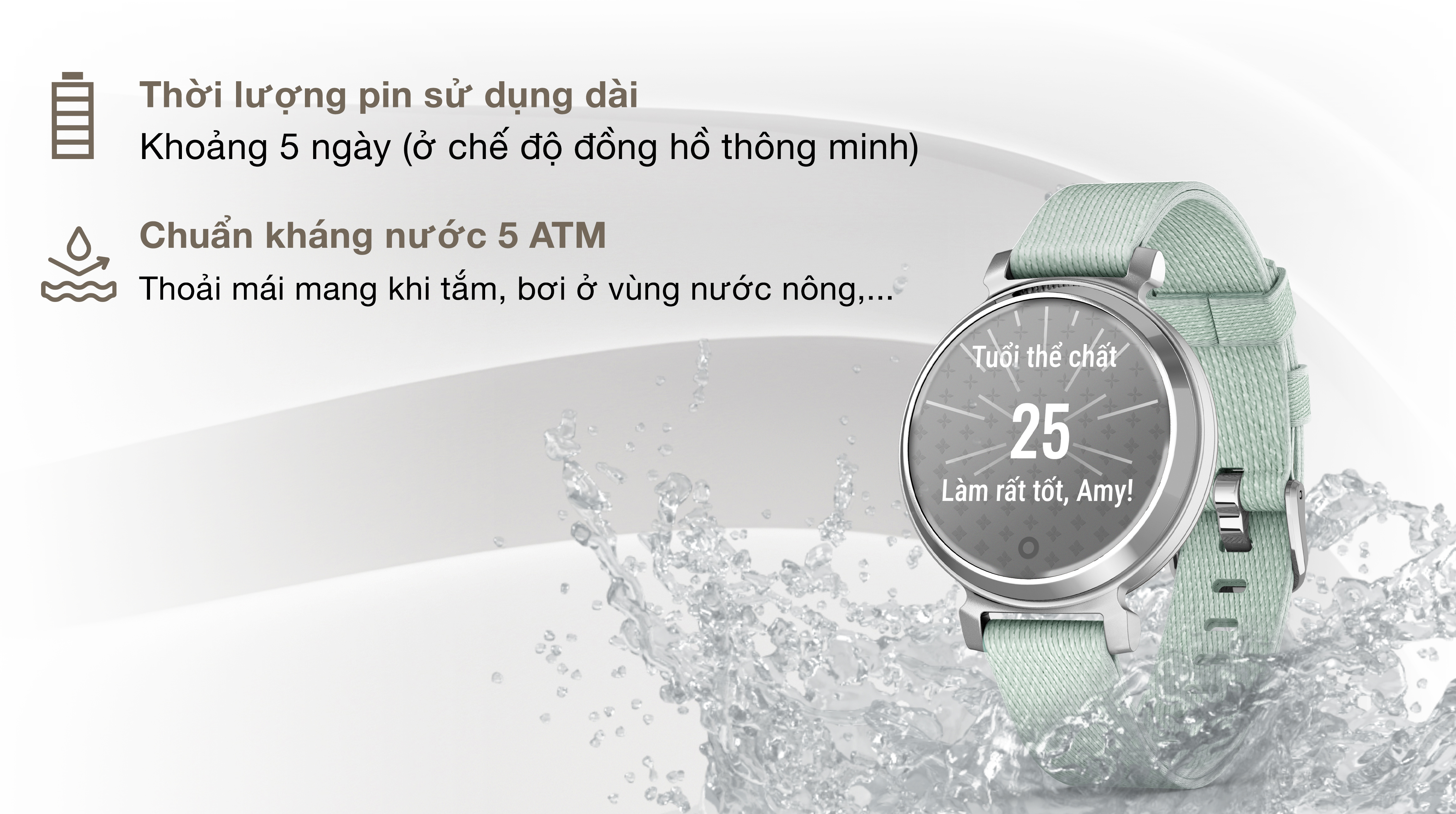 Đồng hồ thông minh còn ghi điểm bởi khả năng kháng nước 5 ATM. Bạn có thể tự tin đeo đồng hồ khi rửa tay, tắm rửa, bơi ở vùng nước nông,... mà không lo hư hỏng. Tuy nhiên, để đảm bảo tuổi thọ cao cho thiết bị, bạn nên lưu ý tránh sử dụng đồng hồ trong môi trường có nhiệt độ cao như phòng tắm hơi, tiếp xúc trực tiếp với nước nóng, hóa chất,...