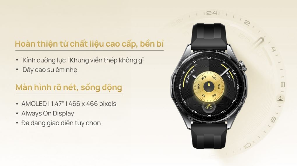 Màn hình AMOLED có độ phân giải 466 x 466 pixels mang đến chất lượng hiển thị sắc nét và rõ ràng. Với màn hình cảm ứng 1.47 inch, bạn có thể dễ dàng thực hiện các thao tác vuốt, chạm một cách chính xác. Màn hình của đồng hồ được bảo vệ bởi lớp kính cường lực, hạn chế trầy xước khi cọ xát với các vật khác.