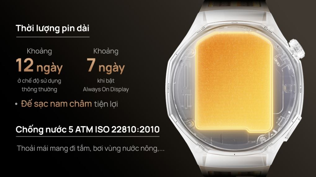 Huawei Watch GT 6 Pro được trang bị viên pin dung lượng lớn, có thể sử dụng liên tục lên đến 12 ngày trong điều kiện thông thường, hoặc khoảng 7 ngày nếu bật chế độ Always On Display. Điều này giúp người dùng thoải mái sử dụng trong thời gian dài mà không lo gián đoạn vì sạc pin.
