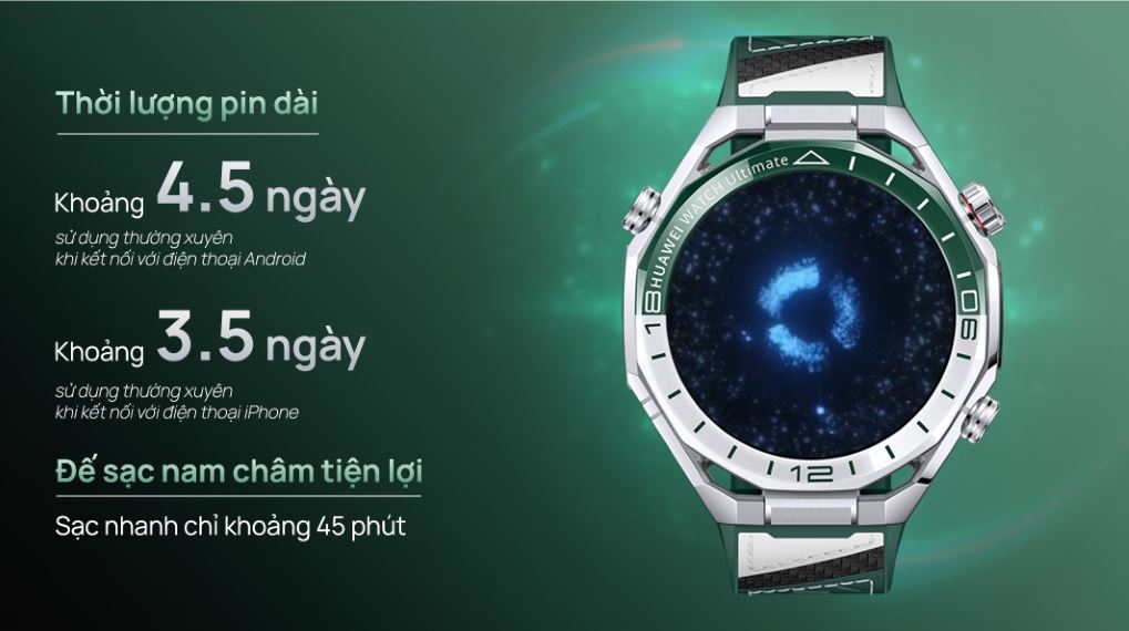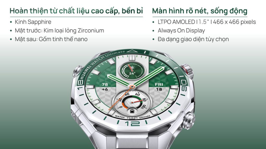 Sự kết hợp giữa màu sắc thiên nhiên dịu mắt cùng những vật liệu bền bỉ nhất thế giới như kim loại lỏng Zirconium và Sapphire đã tạo nên một thiết bị đẳng cấp, sang trọng nhưng không kém phần mạnh mẽ. Dù bạn là một golfer đang tìm kiếm sự chính xác trên sân cỏ, một thợ lặn muốn khám phá kỳ quan dưới đáy biển, hay một doanh nhân cần một biểu tượng của sự thành đạt, Huawei Watch Ultimate 2 Xanh Lá luôn là lựa chọn hoàn hảo để khẳng định phong thái riêng biệt và tinh thần chinh phục không giới hạn.