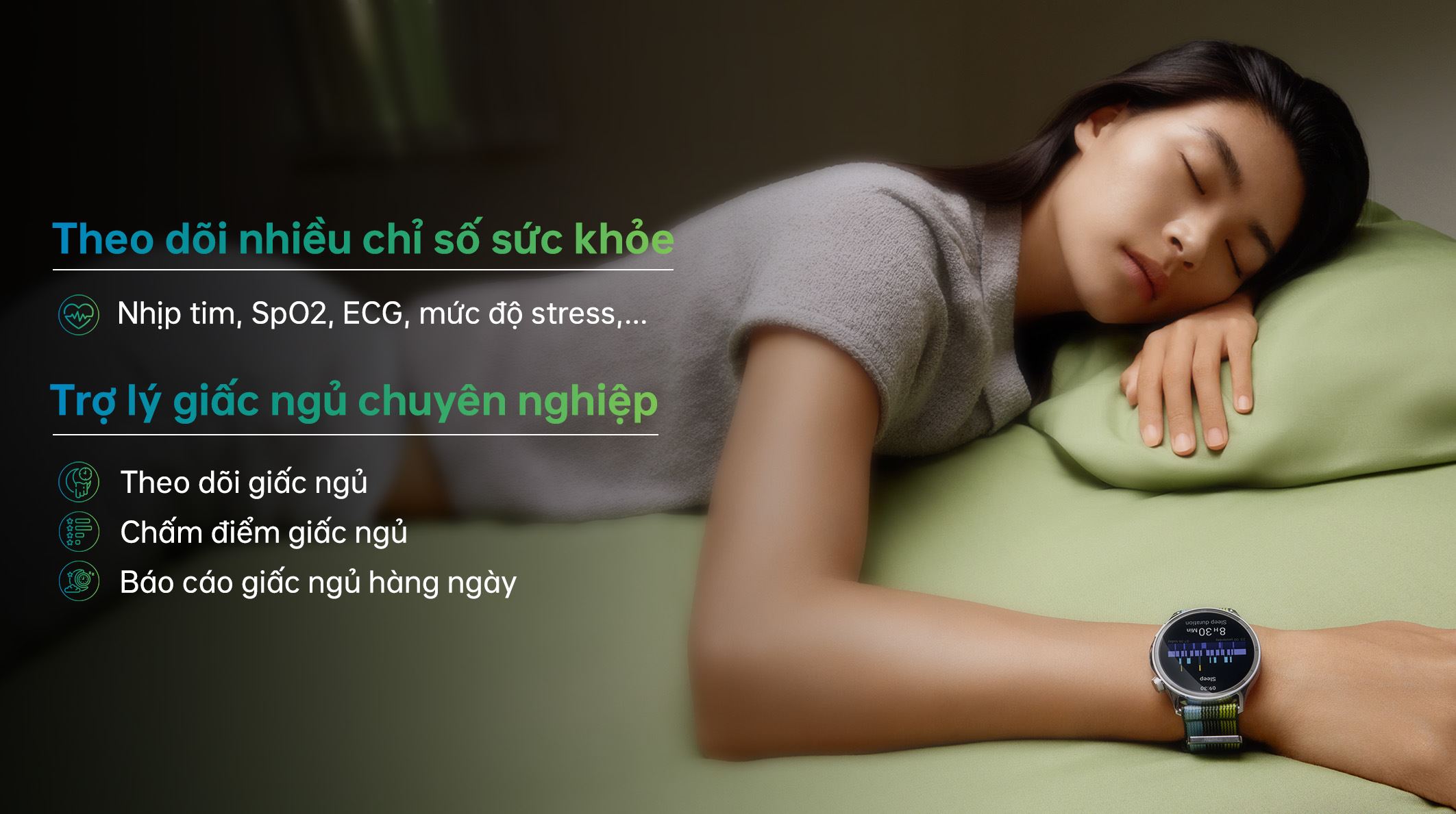 OPPO Watch S được trang bị cảm biến ECG giúp phân tích tín hiệu tim mạch chuyên sâu, hỗ trợ theo dõi sức khỏe tim và phát hiện sớm các dấu hiệu bất thường. Bên cạnh đó, đồng hồ còn theo dõi liên tục các chỉ số quan trọng như nhịp tim, nồng độ oxy trong máu (SpO₂), chất lượng giấc ngủ,...