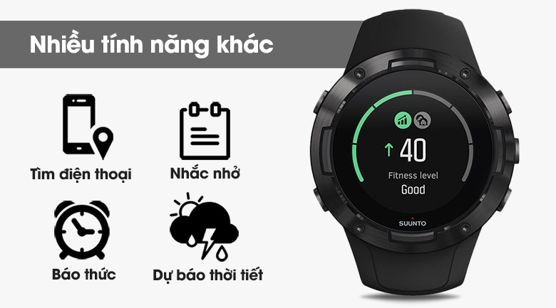 Ngoài ra bạn còn có thể trải nghiệm các tính năng khác trên chiếc đồng hồ đến từ hãng Suunto này như lộ trình đường đi, la bàn, đồng hồ bấm giờ, rung thông báo, báo giờ mặt trời mọc, mặt trời lặn, thay mặt đồng hồ, nhận cuộc gọi, tìm điện thoại, nhắc nhở, đếm bước chân, báo thức, dự báo thời tiết