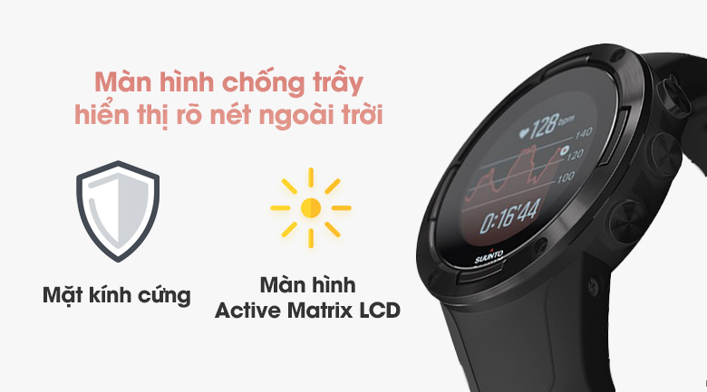 Đồng hồ Suunto có màn hình Active Matrix LCD with LED Backlight 1.1 inch hiển thị mọi thông tin, màu sắc sống động, sắc nét và chi tiết hơn, đặc biệt là khả năng chống chói khi dùng ngoài trời. Ngoài ra, mặt kính cứng còn giúp bảo vệ tốt cho mặt đồng hồ khỏi trầy xước.
