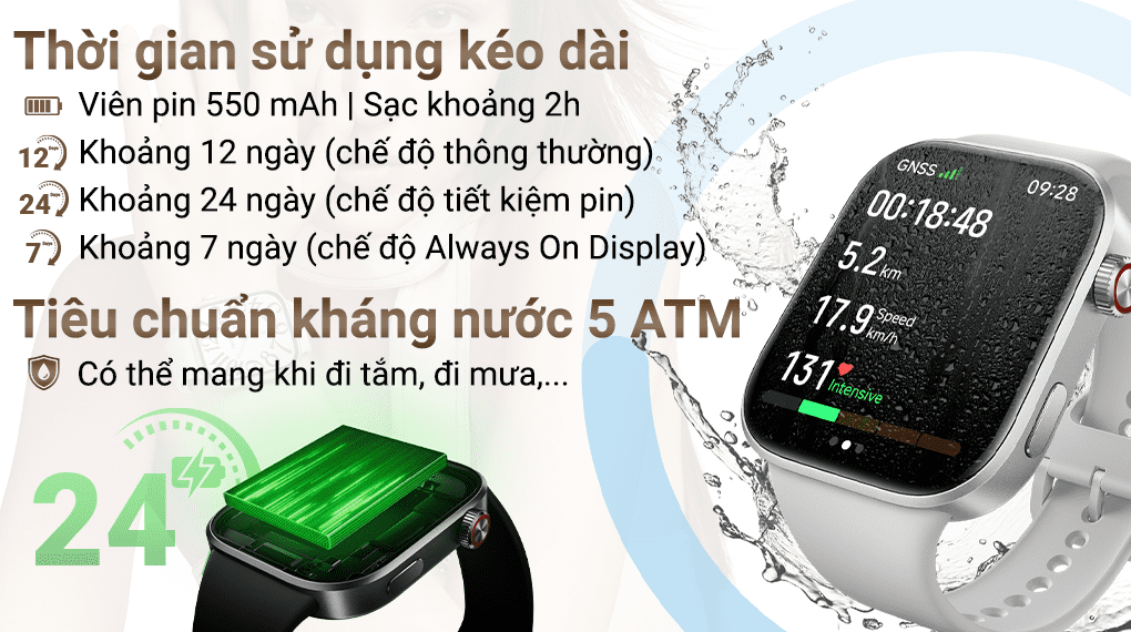 Bên cạnh đó, đồng hồ đạt tiêu chuẩn kháng nước 5 ATM, cho phép bạn thoải mái sử dụng khi đi mưa, đi tắm, tập thể thao,... Để bảo vệ thiết bị lâu dài, người dùng nên hạn chế đeo đồng hồ khi xông hơi, lặn sâu hoặc tiếp xúc với dòng nước có áp lực mạnh và hóa chất tẩy rửa.