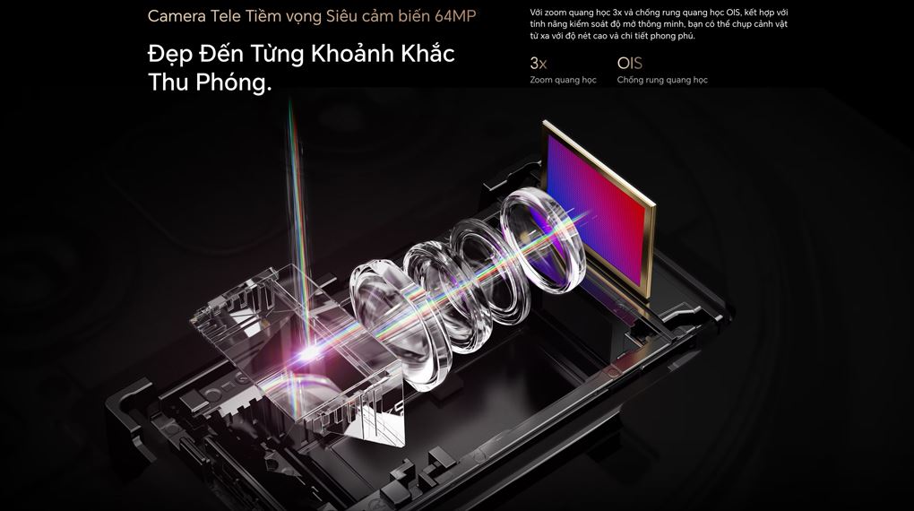 Điểm nhấn đáng chú ý là camera tele tiềm vọng 64 MP với zoom quang học 3x và chống rung OIS, giúp bạn chụp các chủ thể ở xa rõ nét mà không bị giảm chất lượng. Khi kết hợp với siêu zoom AI, những khung cảnh xa xôi như được kéo lại gần hơn, rất thích hợp để ghi lại phong cảnh, sân khấu hay các sự kiện thể thao một cách sống động.