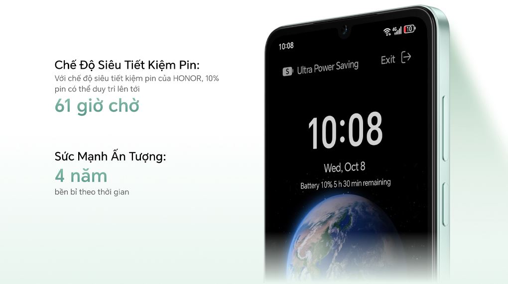 HONOR X5c Plus 128GB tích hợp chế độ siêu tiết kiệm pin khá hữu ích cho những lúc cần thiết. Khi chỉ còn 10% pin, máy vẫn có thể duy trì thời gian chờ lên đến 61 giờ để bạn giữ liên lạc. Đặc biệt, viên pin được thiết kế bền bỉ với khả năng giữ lại trên 87% dung lượng sau 1000 lần sạc, giúp bạn yên tâm sử dụng lâu dài.