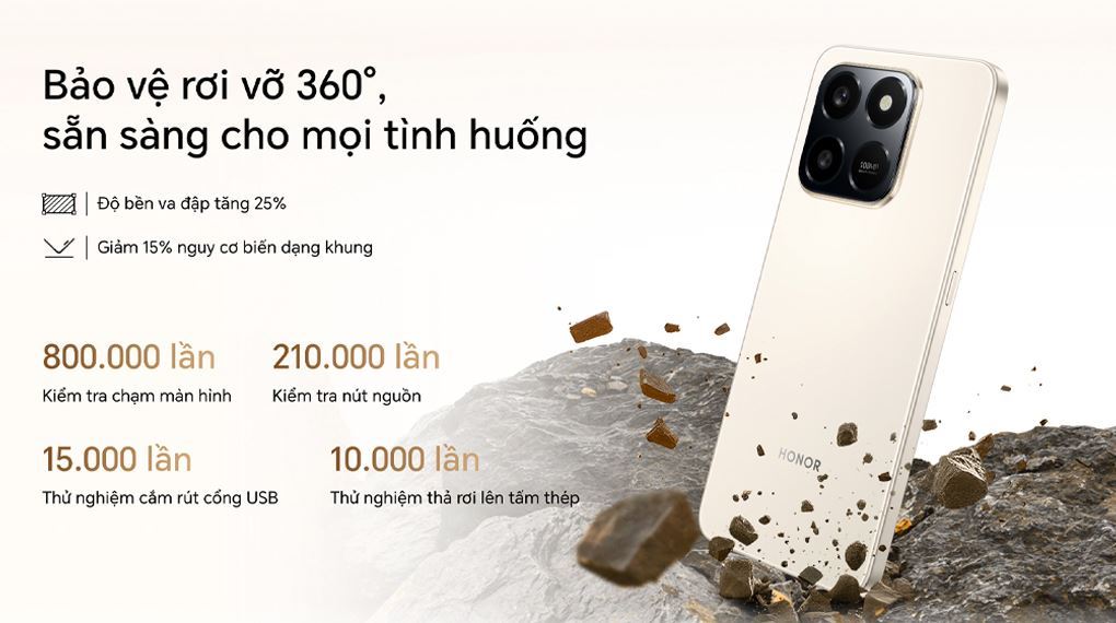 Tiêu chuẩn bảo vệ rơi vỡ toàn diện 360 độ của HONOR X7d đã đạt chứng nhận 5 sao từ tổ chức SGS. Cụ thể, máy có khả năng chống chịu va đập khi rơi từ độ cao 2 mét. Độ bền va đập của thiết bị được tăng cường thêm 25%, đồng thời giảm thiểu 15% nguy cơ biến dạng khung viền trong quá trình sử dụng hàng ngày.