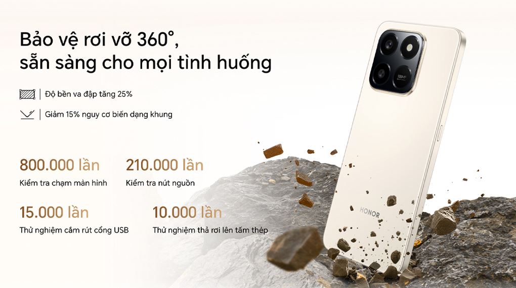 Điểm mạnh nổi bật của HONOR X7d nằm ở độ bền đã được kiểm chứng nghiêm ngặt. Máy đạt chứng nhận SGS Thụy Sĩ về khả năng chống rơi vỡ, chịu lực tốt hơn 25% so với thông thường. Bên cạnh cấu trúc chắc chắn, thiết bị còn cam kết giữ hiệu năng pin trên 80% sau 5 năm, mang lại sự yên tâm và giá trị sử dụng lâu dài cho người dùng.