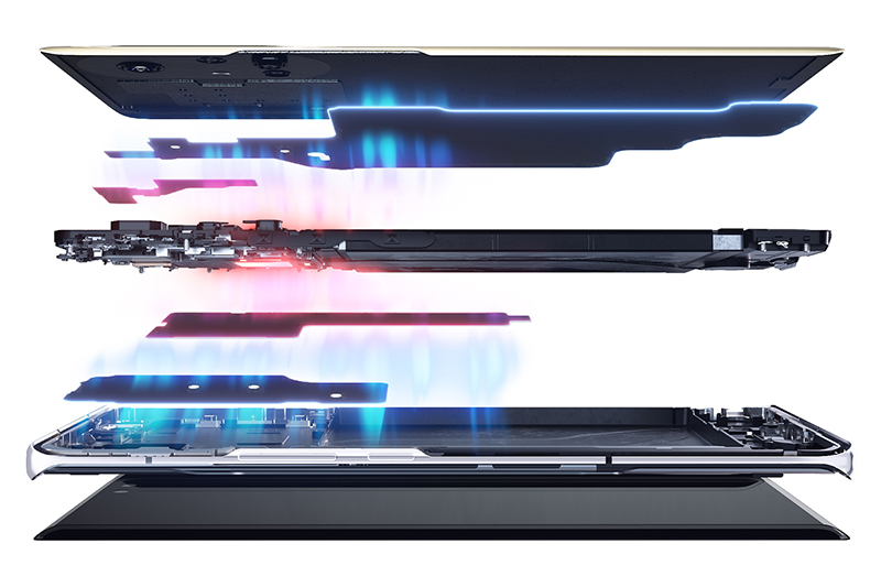 Khung viền máy theo thiết kế thác nước đổ từ 2 cạnh màn hình dọc theo thân máy mở rộng tối đa diện tích hiển thị đáng kể không gian màn hình, tăng sự trải nghiệm của người dùng.