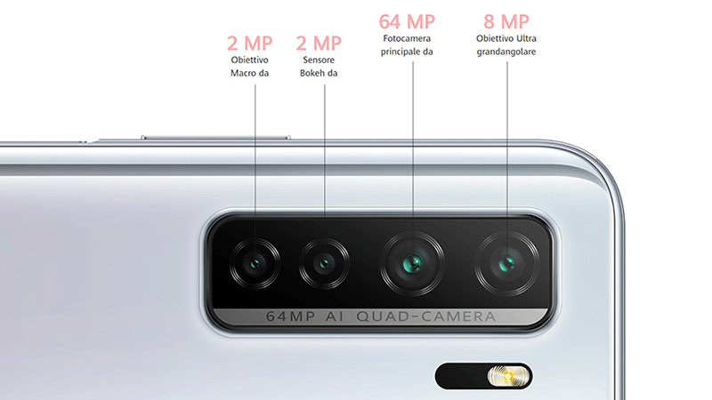 Một điểm nhấn rất đáng chú ý trên Huawei P40 Lite 5G là cụm 4 camera với cảm biến chính 64 MP, camera phụ góc siêu rộng 8 MP cùng với 2 ống kính 2 MP hỗ trợ chup macro và đo chiều sâu.