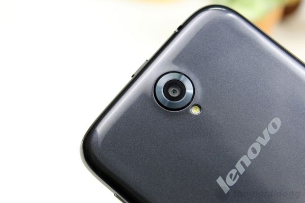 Mặt sau của máy là camera 5MP cùng đèn flash được đặt chính giữa. Camera khá to và lồi ra ngoài trông rất “hầm hố”. Phía dưới là logo Lenovo, và cuối mặt sau là loa ngoài hơi lệch về phía bên phải một chút.