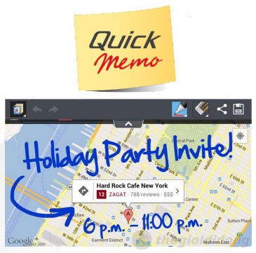 Tính năng QuickMemo cho phép bạn nhanh chóng và dễ dàng chụp ảnh màn hình và ghi chú trên màn hình chỉ bằng một ngón tay. Sau đó, người dùng có thể chia sẻ chúng với bạn bè hoặc người thân thông qua mạng xã hội, tin nhắn văn bản và email dễ dàng hơn nhiều so với trước đây.