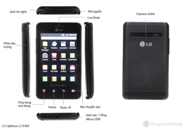 Người dùng có thể tìm thấy ở LG Optimus L3 405 thiết kế trang nhã, vuông vức, độ mỏng đáng kể nhưng vẫn gọn gàng thuận tiện khi cầm trên tay thao tác.