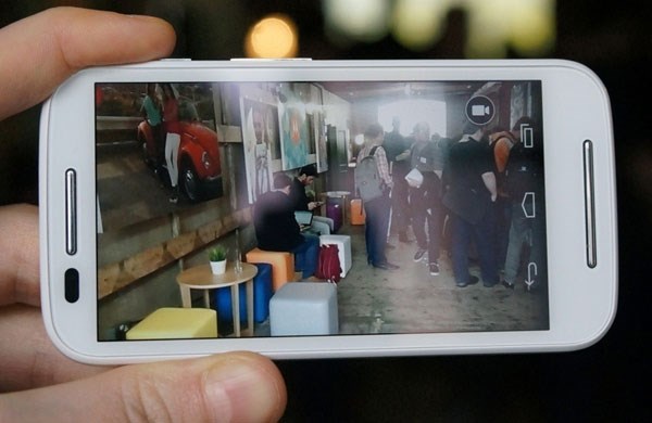 Camera của Moto E được thiết kế lõm vào so với bề mặt phía sau, do đó mặt kính được bảo vệ tốt hơn. Camera không hỗ trợ đèn Flash LED, chụp ảnh trong điều kiện thiếu sáng sẽ bị hạn chế. Máy không trang bị camera trước. Tuy nhiên, chất lượng ảnh của camera sau khá tốt, màu sắc tươi sáng, sắc nét trong điều kiện ánh sáng trời đầy đủ. Máy trang bị tính năng chụp nghệ thuật HDR và Panorama khá hiện đại.