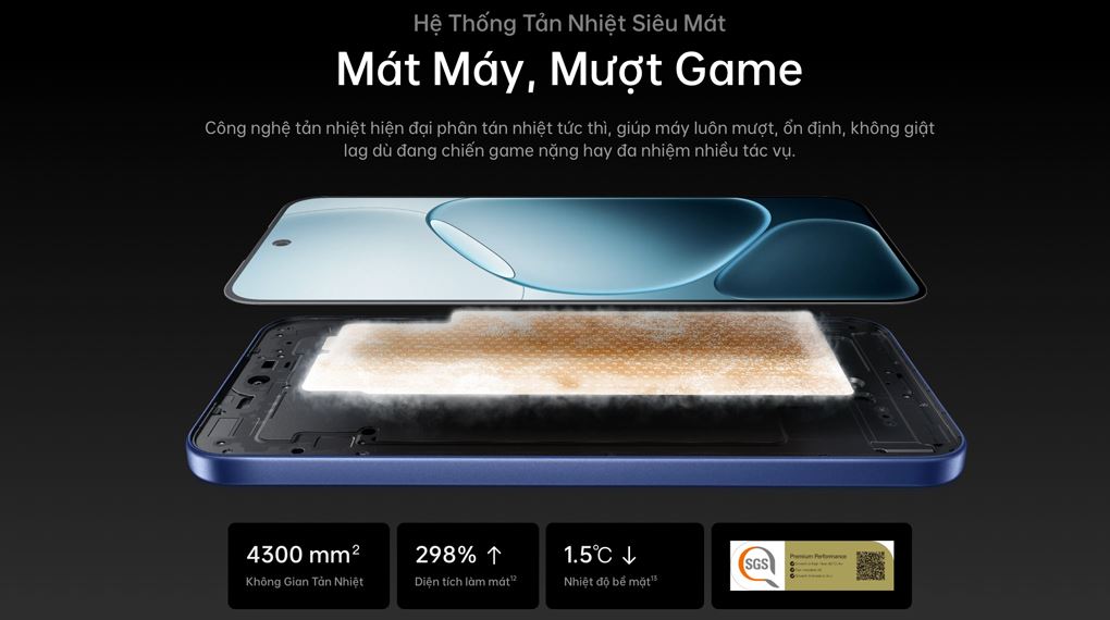Chiếc điện thoại OPPO này sử dụng hệ thống tản nhiệt VC có diện tích lên đến 4300 mm², giúp nhiệt được phân tán nhanh hơn và giữ bề mặt luôn mát mẻ kể cả khi dùng liên tục. Nhờ diện tích làm mát tăng 298% so với thế hệ trước, máy duy trì nhiệt độ ổn định hơn, tạo cảm giác cầm dễ chịu và đồng thời bảo vệ linh kiện, giúp thiết bị vận hành bền bỉ theo thời gian.