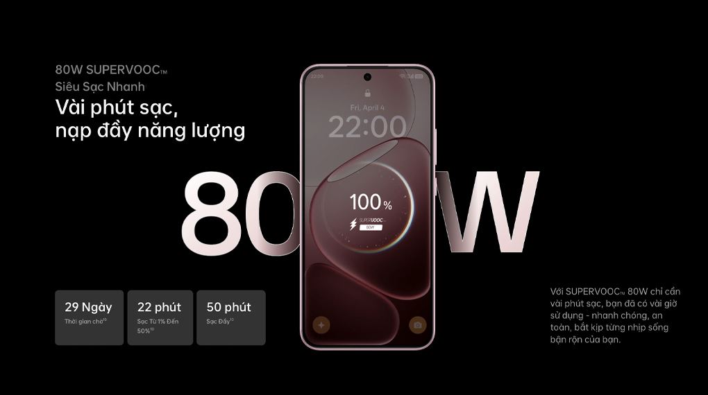 Máy hỗ trợ sạc nhanh SuperVOOC 80W, nạp 50% chỉ trong 22 phút và đầy 100% trong 50 phút, giúp tiết kiệm thời gian tối đa. Ngoài ra, tính năng sạc ngược có dây biến OPPO A6 Pro 5G thành pin dự phòng tiện lợi, sạc cho tai nghe, đồng hồ hay điện thoại khác khi cần.