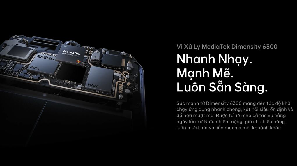 OPPO A6 Pro 5G trang bị chip MediaTek Dimensity 6300 5G với 8 nhân mạnh mẽ, mang lại hiệu năng ổn định và tiết kiệm năng lượng. Máy xử lý mượt mọi tác vụ hằng ngày như lướt web, xem video hay đa nhiệm, trong khi GPU Mali-G57 MC2 đảm bảo đồ họa mượt mà, chơi tốt các game phổ biến ở mức thiết lập hợp lý.