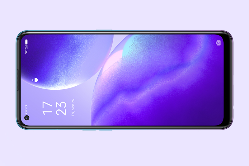 Reno5 Z trang bị màn hình Super AMOLED có khả năng tự động điều chỉnh độ sáng theo từng môi trường, độ sáng tối đa 800 nit và độ tương phản cao giúp máy hiển thị rõ ràng, rực rỡ ngay cả dưới ánh nắng mặt trời.