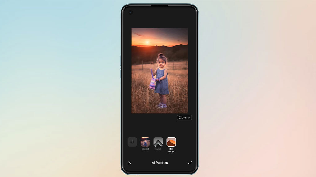 Reno6 4G còn hỗ trợ AI Palette giúp tái tạo hình ảnh của bạn với nhiều bộ lọc màu, giúp cho bạn có thể lưu những bức ảnh với nhiều phong cách chụp khác nhau.