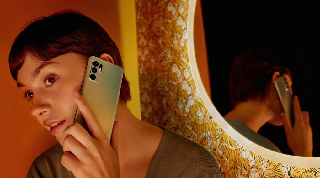 Reno6 4G là sản phẩm có thiết kế vô cùng hoàn hảo và ấn tượng, phần mặt lưng sử dụng công nghệ Reno Glow với bề mặt nhám tăng độ bám khi cầm và giảm bám vân tay nhưng vẫn có thể đổi máu óng ánh theo góc nhìn.