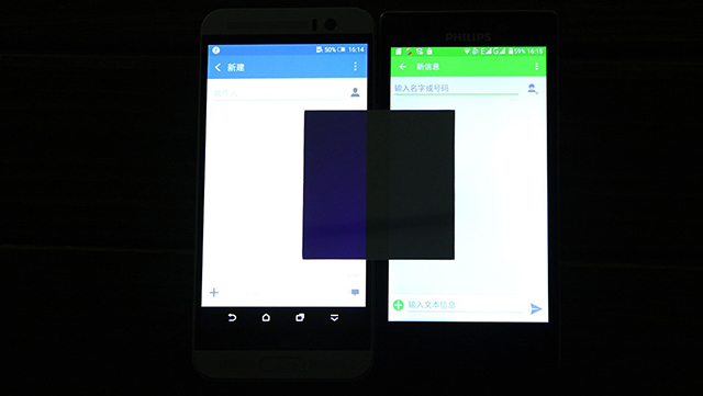 So sánh ánh sáng xanh phát ra từ Philips Sapphire Life V787 với một sản phẩm khác (máy Philips tay phải)