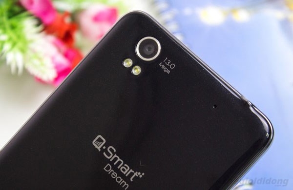 Mặt lưng của Q-Smart Dream SI bằng nhựa trơn bóng với camera ở góc trái cùng hai đèn flash bên dưới, một điểm nhấn tạo sự khác biệt cho sản phẩm. Nhìn chung, thiết bị có thiết kế bắt mắt, cho cảm giác cao cấp và sang trọng. tuy nhiên mặt sau bằng nhựa nên có thể sẽ dễ bị trầy xước.