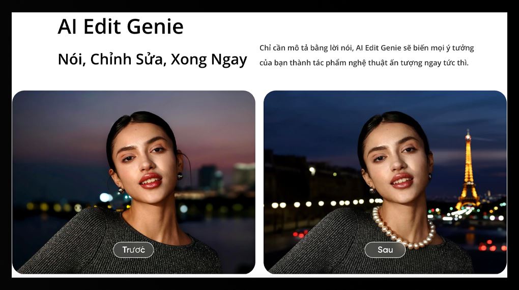 Ngoài ra, máy còn hỗ trợ quay video 4K bằng cả camera trước và sau. Tính năng AI Edit Genie cho phép người dùng chỉnh ảnh và video bằng giọng nói, hỗ trợ hơn 20 ngôn ngữ khác nhau. Chỉ cần mô tả ý tưởng, hệ thống AI sẽ tự động cắt ghép, chỉnh màu và thêm hiệu ứng. Đây là công cụ hữu ích cho người dùng yêu thích sáng tạo nội dung hoặc quay vlog hàng ngày.