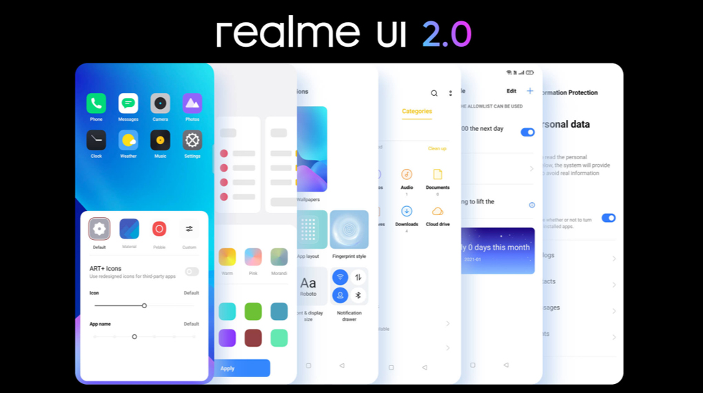 Thiết bị sử dụng hệ điều hành Android 11, giao diện Realme UI 2.0 trực quan thân thiện, có nhiều biểu tượng và tùy chỉnh trên màn hình điện thoại dễ dàng.