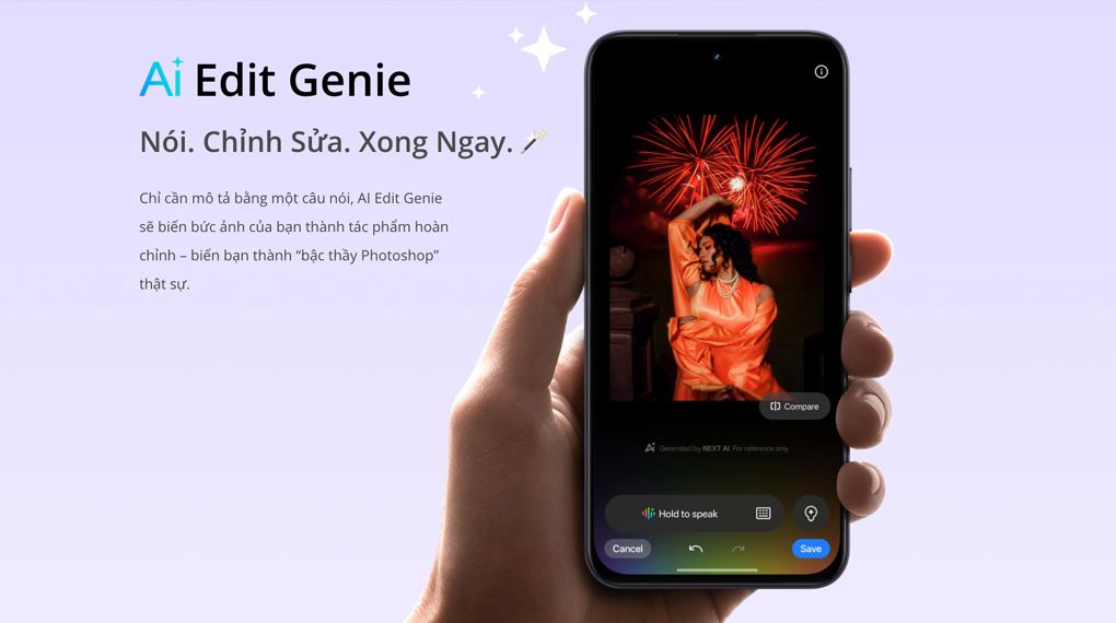 Điểm nổi bật của hệ thống camera trên realme C85 Pro là bộ công cụ chỉnh sửa AI thông minh. AI Edit Genie cho phép chỉnh sửa ảnh chỉ bằng câu lệnh đơn giản, trong khi tính năng xóa vật thể giúp loại bỏ chi tiết thừa chỉ với một cú chạm. Các tính năng như siêu rõ nét và sửa lỗi mờ cũng hỗ trợ nâng cao chất lượng ảnh đáng kể, biến thiết bị thành một công cụ chỉnh sửa tiện lợi ngay trên điện thoại.