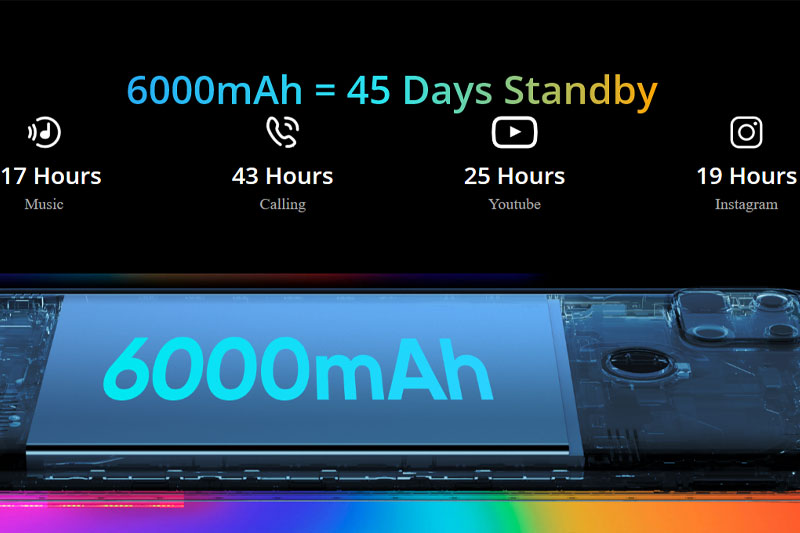 Narzo 20 được gọi là điện thoại pin trâu khi sở hữu viên pin khủng 6.000 mAh giúp bạn có thể dễ dàng sử dụng điện thoại trong khoảng hai ngày hay thời gian chờ lên đến khoảng 1 tháng hơn sau một lần sạc đầy.