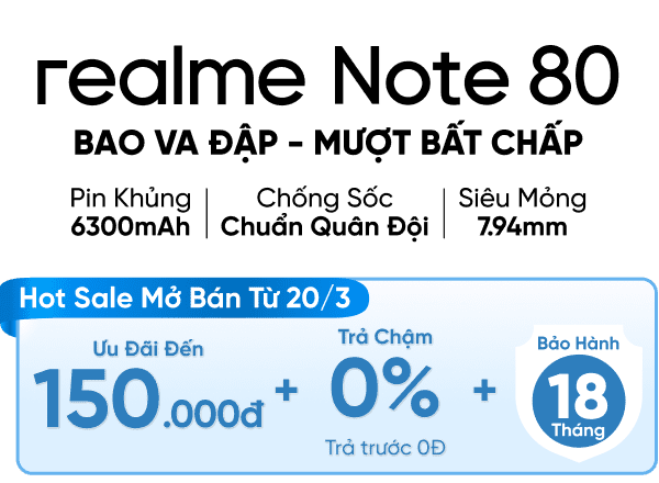 realme Note 80 hướng đến người dùng cần một thiết bị bền bỉ và ổn định lâu dài. Với ưu điểm là viên pin dung lượng lớn cùng khả năng chống va đập chuẩn quân đội, sản phẩm đáp ứng tốt nhu cầu làm việc và giải trí. Đây là lựa chọn phù hợp giúp bạn an tâm sử dụng máy trong nhiều môi trường khác nhau.