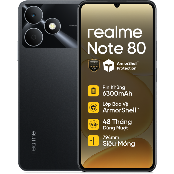 Khung bảo vệ ArmorShell kết hợp cùng chuẩn quân đội MIL-STD 810H giúp realme Note 80 đạt độ bền ấn tượng. Cấu trúc này cho phép thiết bị chịu đựng được những bài kiểm tra thả rơi ở độ cao tối đa 1.8 mét. Nhờ vậy, bạn có thể yên tâm hơn khi vô tình làm rơi máy trong các hoạt động sinh hoạt hoặc quá trình làm việc hàng ngày.
