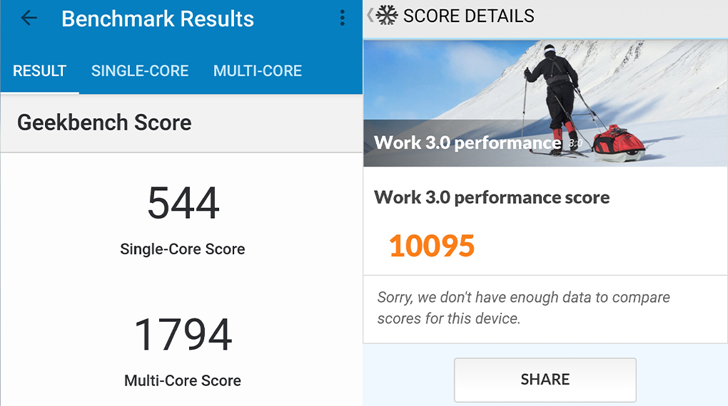 Mình đã sử dụng 2 phần mềm đánh giá hiệu năng để có cái nhìn tổng quan hơn về máy, kết quả như sau: 544 (lõi đơn), 1794 (đa lõi) trong BenchMark và 10095 trong PCMark.