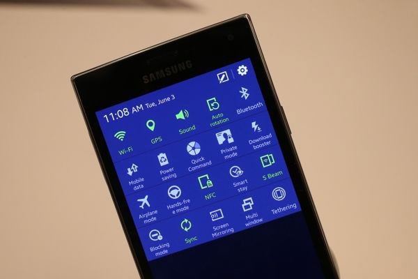 Một điểm khiến bạn nhớ đến các sản phẩm cao cấp khác của Samsung đó là nút ấn vật lý phía dưới màn hình và mặt lưng giả da phía sau máy, điểm mà ta thấy nhiều smartphone cao cấp như Galaxy Note 3 hay Note 10.1.