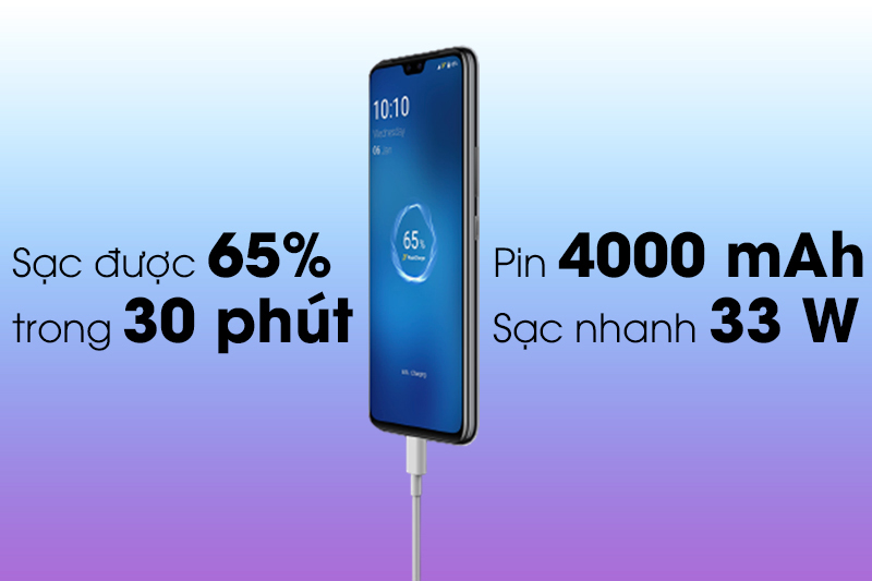 Ngoài ra, Vivo trang bị cho “con cưng” của mình công nghệ sạc pin nhanh 33W, giúp tiết kiệm tối đa thời gian sạc. Sạc nhanh lên đến 65% chỉ trong 30 phút và bạn có thể đi làm, đi du lịch,... thoải mái mà không còn lo lắng về hết pin hay sạc lâu nữa.
