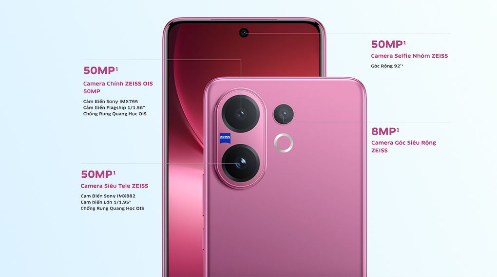 vivo V60 sở hữu bốn camera ấn tượng, nổi bật với camera chính 50 MP ZEISS OIS. Ống kính này dùng cảm biến Sony IMX766 kích thước 1/1.56 inch, loại cảm biến cao cấp thường chỉ xuất hiện trên flagship. Kết hợp công nghệ chống rung quang học OIS, hình ảnh luôn sắc nét ngay cả khi thiếu sáng hoặc tay bị rung.