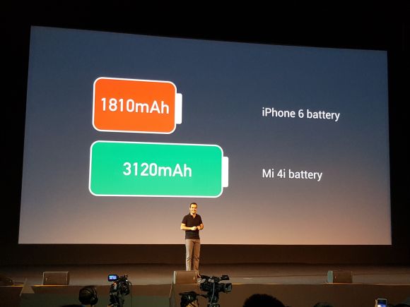 Buổi lễ ra mắt, màn hình Xiaomi Mi 4i có mật độ độ điểm ảnh cao hơn nhiều so với iPhone 6, 6 Plus khi so sánh về mật độ điểm ảnh