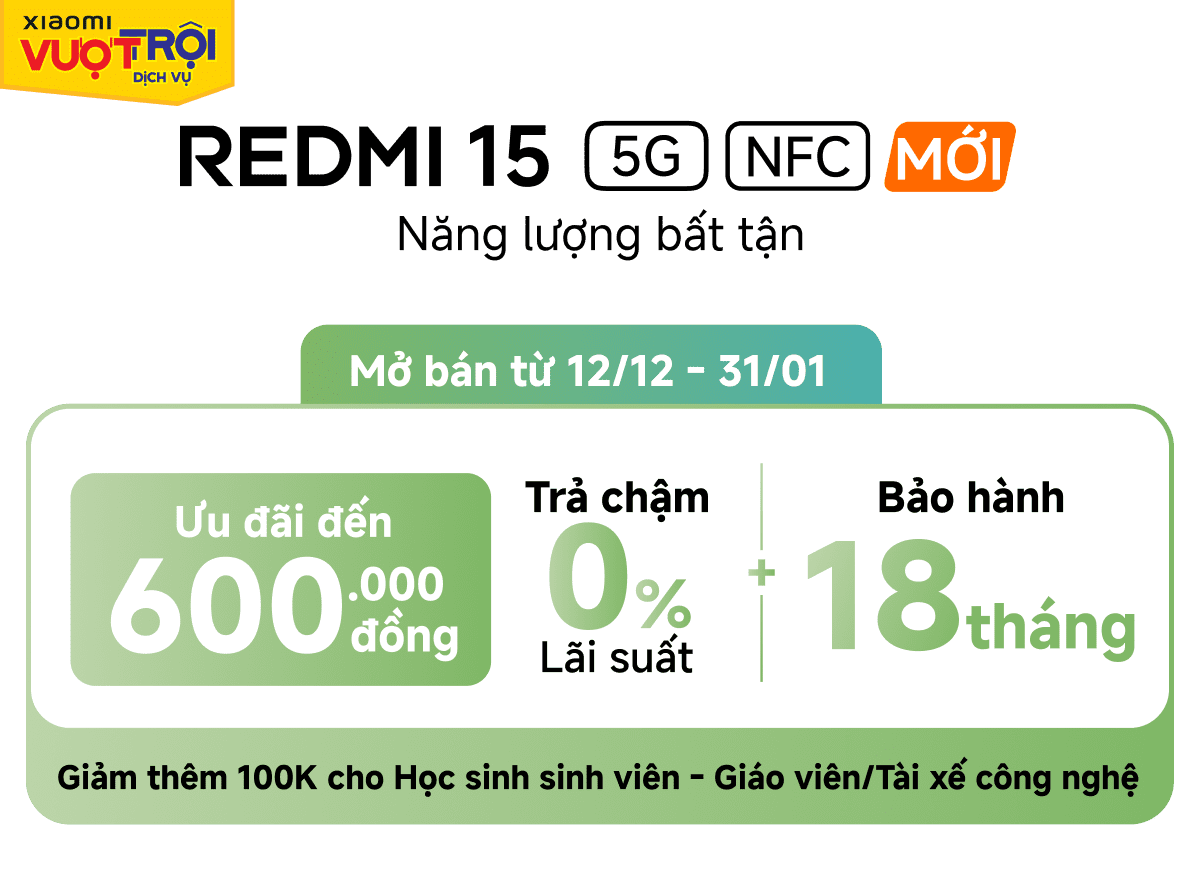 Xiaomi Redmi 15 5G là lựa chọn hợp lý cho ai cần pin lâu, hiệu năng ổn định và trải nghiệm giải trí mượt mà trên màn hình lớn. Máy có camera chất lượng, vận hành trơn tru và mức giá dễ tiếp cận. Nếu muốn một chiếc điện thoại bền bỉ để dùng hằng ngày, Redmi 15 5G là cái tên đáng cân nhắc. Hãy ghé Thegioididong.com để xem máy trực tiếp và nhận nhiều ưu đãi hấp dẫn.