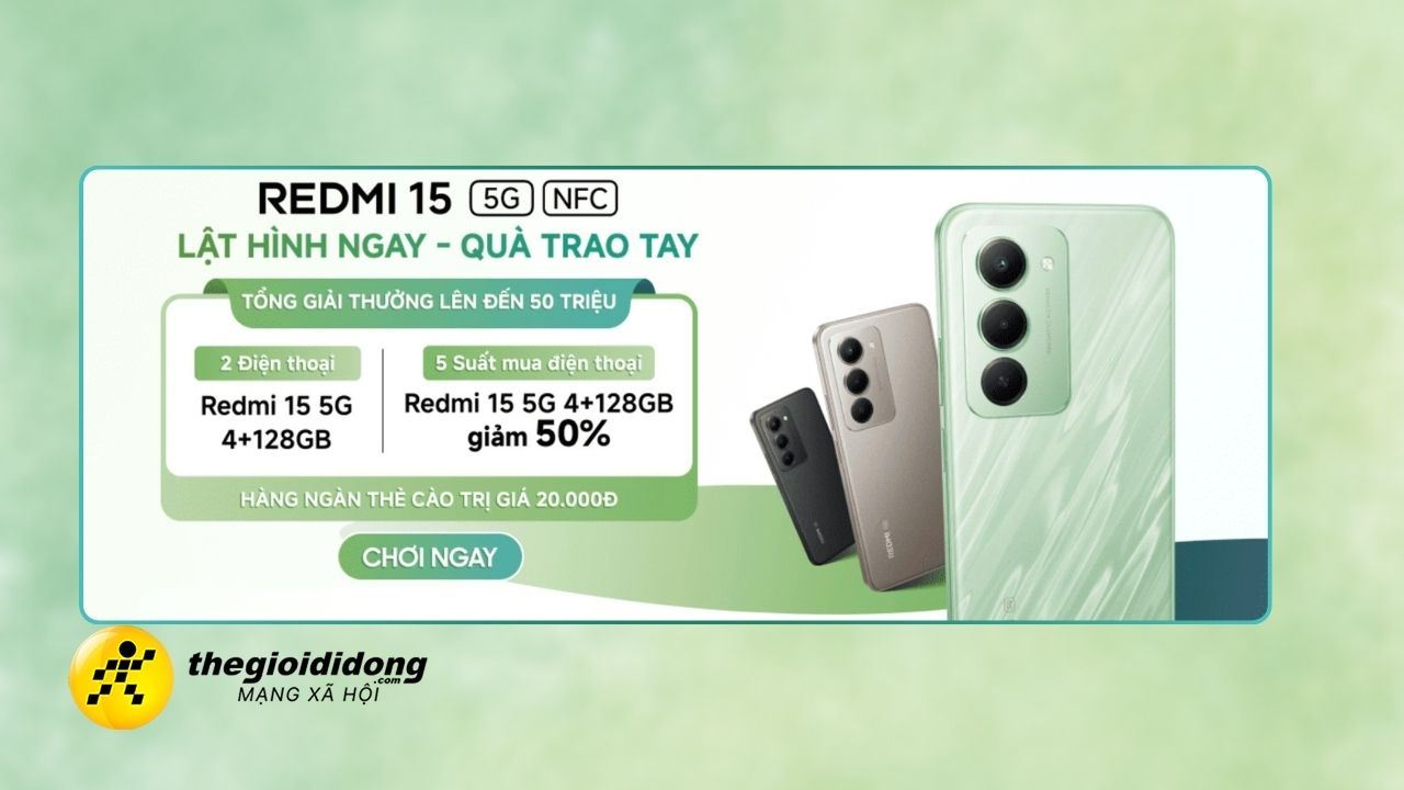 Xiaomi Redmi 15 5G là lựa chọn hợp lý cho ai cần pin lâu, hiệu năng ổn định và trải nghiệm giải trí mượt mà trên màn hình lớn. Máy có camera chất lượng, vận hành trơn tru và mức giá dễ tiếp cận. Nếu muốn một chiếc điện thoại bền bỉ để dùng hằng ngày, Redmi 15 5G là cái tên đáng cân nhắc. Hãy ghé Thegioididong.com để xem máy trực tiếp và nhận nhiều ưu đãi hấp dẫn.