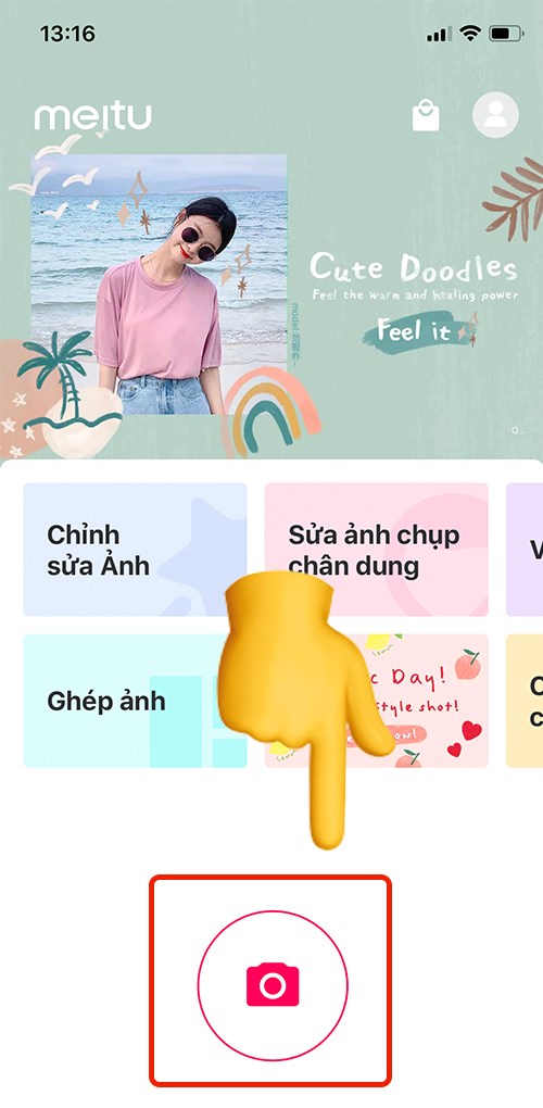 Bước 1: Đầu tiên bạn mở ứng dụng Meitu, tại giao diện trang chủ > Nhấn vào biểu tượng máy ảnh.