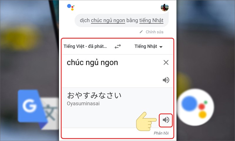 Bước 5: Bản dịch sẽ hiển thị ngay bên dưới đoạn hội thoại gốc. Mỗi đoạn hội thoại được dịch sang đều có biểu tượng loa để bạn có thể nhấp vào và nghe cách phát âm từ Google Assistant.